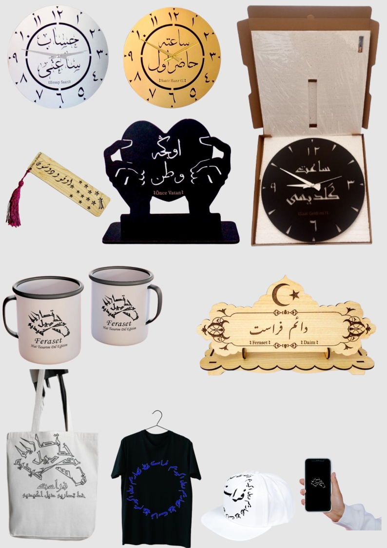 Eşyalar-Hat-Tasarım-Grafik-Osmanlıca-Osmanlı-Türkçesi-Eski-Eskimez-Yazı-Kur'an-Harfleri-kitabeler-çanta-biligisayar-cep-telefonu-şapka-tablo-marka-sembol-duvar saati-ahşap dekoratif-mdflam-masa üstü-isimlik-yazılar-kitap ayracı-ferasetEşya Tasarımı